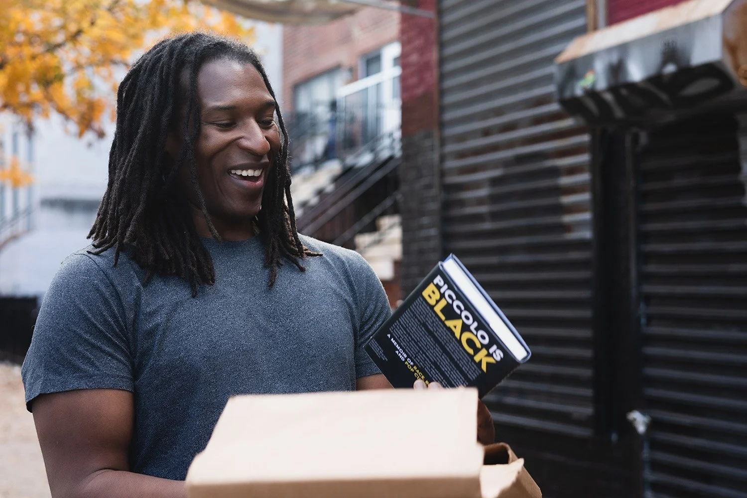 Jordan Calhoun With Advance Copy of His Book, Piccolo Is Black: A Memoir of Race, Religion, and Pop Culture